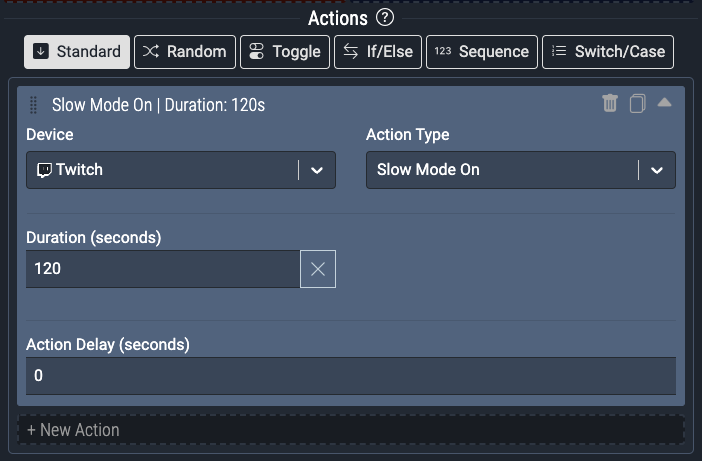 When you add a new action, you’ll need to choose a device that you have available. Then, you can select an Action Type that we support for that device. For example, if we picked Twitch as a device, we can pick Slow Mode On as an action. Once you select a action type that you wish to use, you can then fill in any of the required or optional fields for that action.