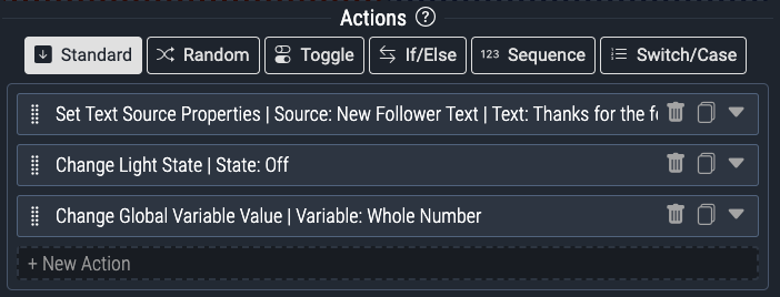 For example, if you have a Twitch Follow trigger in your command and an OBS Set Text Source Properties action type, you can set the text field of the OBS action to the “Twitch: Username” Variable. When someone follows your Twitch channel, the text source in OBS will be set to the new follower’s username: