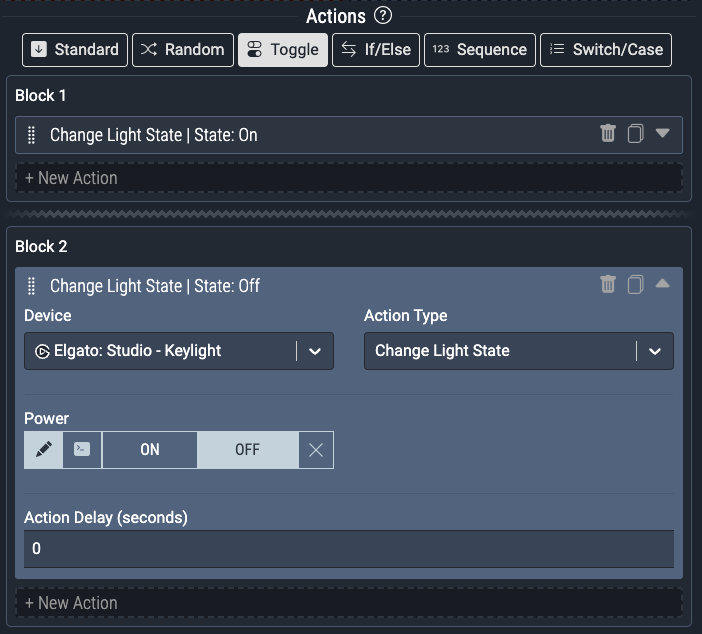 This example has an action to turn on an Elgato Keylight Mini in Step 1, and turn off in Step 2. Allowing the command to toggle the keylight on and off: