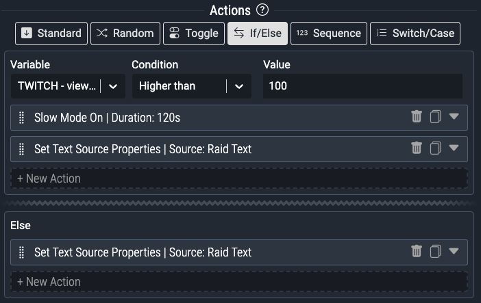 The Switch/Case execution mode is like an extended version of the If/Else mode. You still select a local or global variable to compare, but you can add any number of options to compare the value against. If the command gets triggered and the value of the variable matches one of the option values, the actions inside that option get executed. If the value of the variable matches none of the options, the Default block gets executed. If there are no actions in the default block when it is triggered, nothing happens.