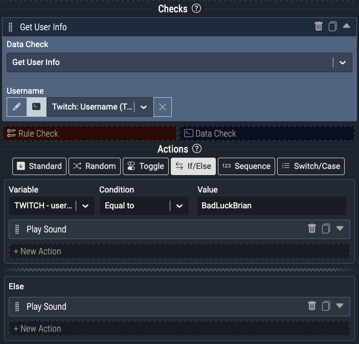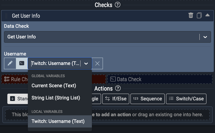 One powerful example is to use the Get User Info Data Check when the trigger of the command is from the Twitch device, such as Channel Point Redemption. Then set the Username field to be the Twitch: Username local variable.