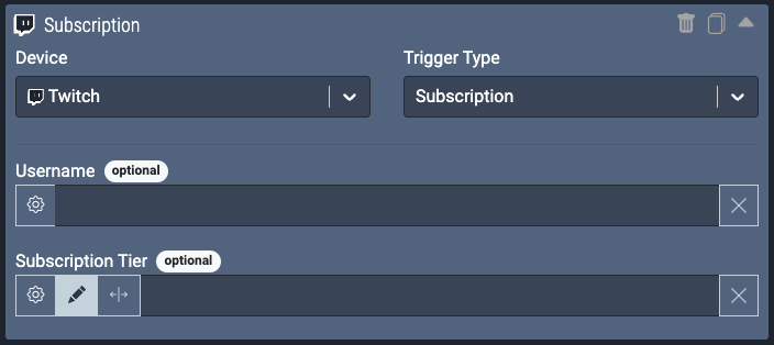 Once you select a trigger type that you wish to use, you can then fill in any of the required or optional fields. Keeping with our example, the Subscription trigger type for Twitch has no required fields, so it could be used as-is and it would fire anytime your channel receives a new subscriber. Or, we could specify a Twitch username that must subscribe to us for the trigger to activate, and thus execute the command.