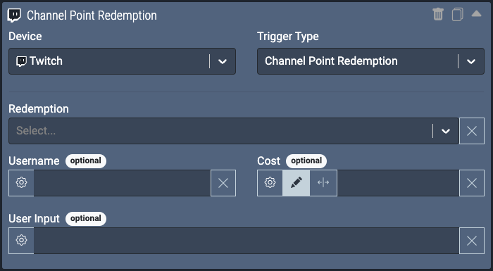 For example, this trigger will fire when any channel point redeem is activated in your Twitch stream: