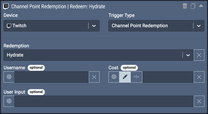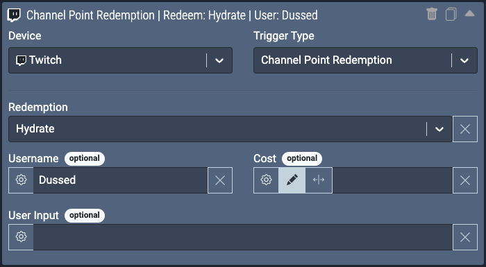 Even further narrowing things down, this trigger will only fire when the Hydrate! redeem is activated by the user Dussed on twitch:
