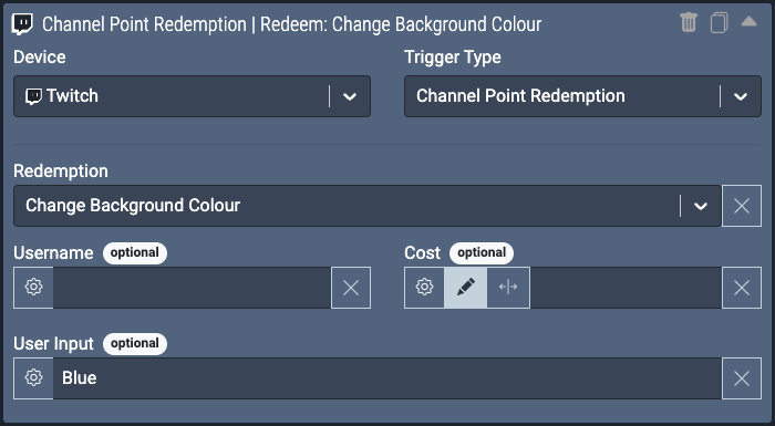 One last example here, assuming this Change Background Colour channel point redeem is setup to set your Hue lights to a specified color based on user input, this trigger will only fire when the user has entered Blue in the user input of the channel point redeem: