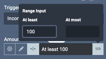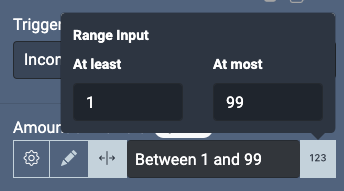 If the type of the field is Whole Number or Decimal, you can change the Input Mode from Normal to Range. If you select the Range mode, you can set a minimum and maximum value for the field, instead of an absolute value. This is useful when you have a trigger such as Incoming Raid from Twitch, as it allows you to set a range for the amount of viewers that would activate the trigger.